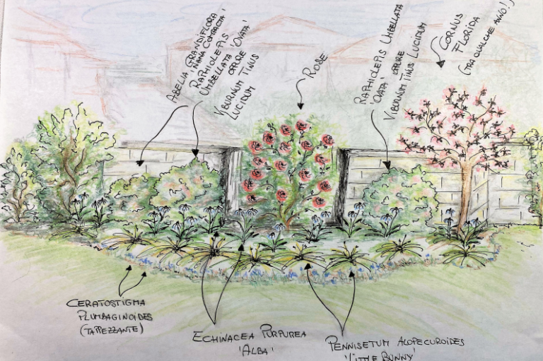 Bordura ancora da realizzare ma il progetto è stato accettato. La richiesta è quella di valorizzare le belle rose centrali, ma nel contemponascondere il muro di cinta. Con l’aiuto del disegno, i committenti possono vedere il progetto realizzato. Sono state mantenute le piantepresenti, ma integrate con arbusti fioriti. Nel piano basso, ci saranno pennisetum, echinacee bianche e ceratostigma tappezzante di colore blu intenso.